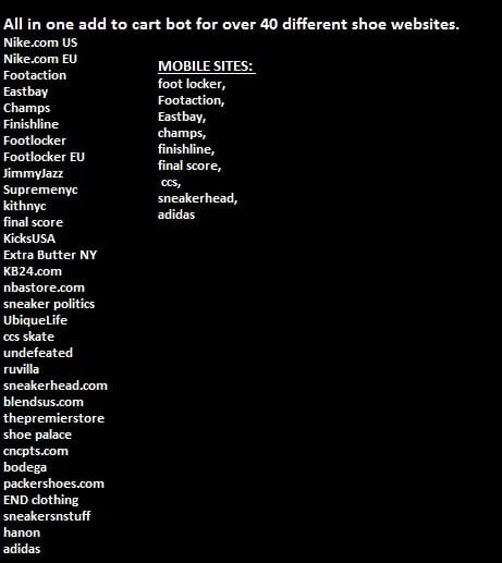 This bot will automatically attempt to add your shoe size to your cart repeatedly until it is in your cart, which is over twice as fast than manually doing it. The bot works for Footlocker-Footaction-Eastbay-Champs-CCS-Finishline-Jimmyjazz-SupremeNY-KithNYC-Nike-FinalScore and more!